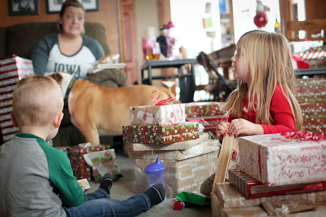 After church, we came back to the lake to open their gift from the elves {PJ's, a Christmas movie, & snack} and then set out milk & cookies, spread reindeer food {half got dumped in the entry way before we made it outside and the other half landed in a big pile in the driveway, so spreading may not be the most accurate term! haha!}, and read The Night Before Christmas & Santa is Coming to Iowa before tucking the kids into bed so Santa's Elves {mom, dad, & Grandpa Dean} could spend the next 2.5 hours putting together Jordyn's doll house and preparing for Christmas morning.