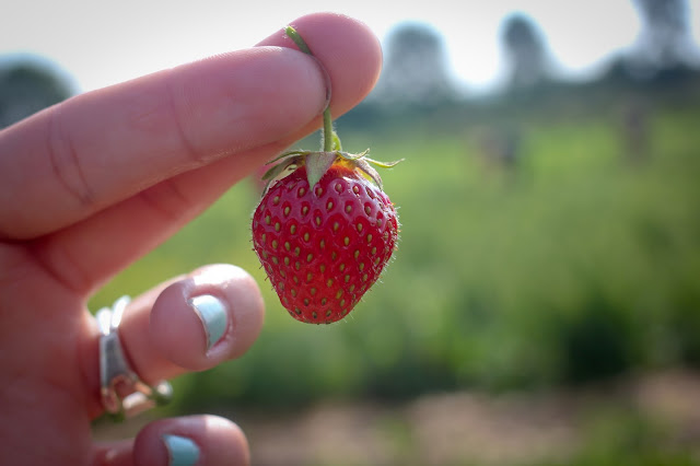 Much like our strawberry picking in 2013, it was hot & muggy but we were at the very end of the season and had to get out there when we could! Unlike last year, Jordyn wasn't very interested in picking strawberries this year. Maybe it was the small strawberries {end of season} maybe it was the heat {it was so sunny!} but she just wasn't feeling it. Cullyn however was such a bit helper! He would have stayed out there picking & eating strawberries all day! :)